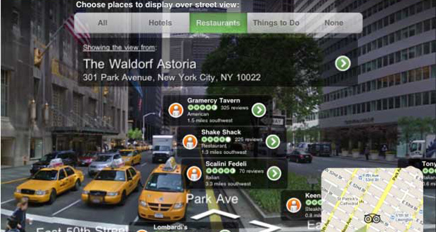 Funciona com realidade aumentada, então é só você apontar o seu smartphone para algum estabelecimento que logo aparece os comentários e as avaliações de outras pessoas. Muito legal!